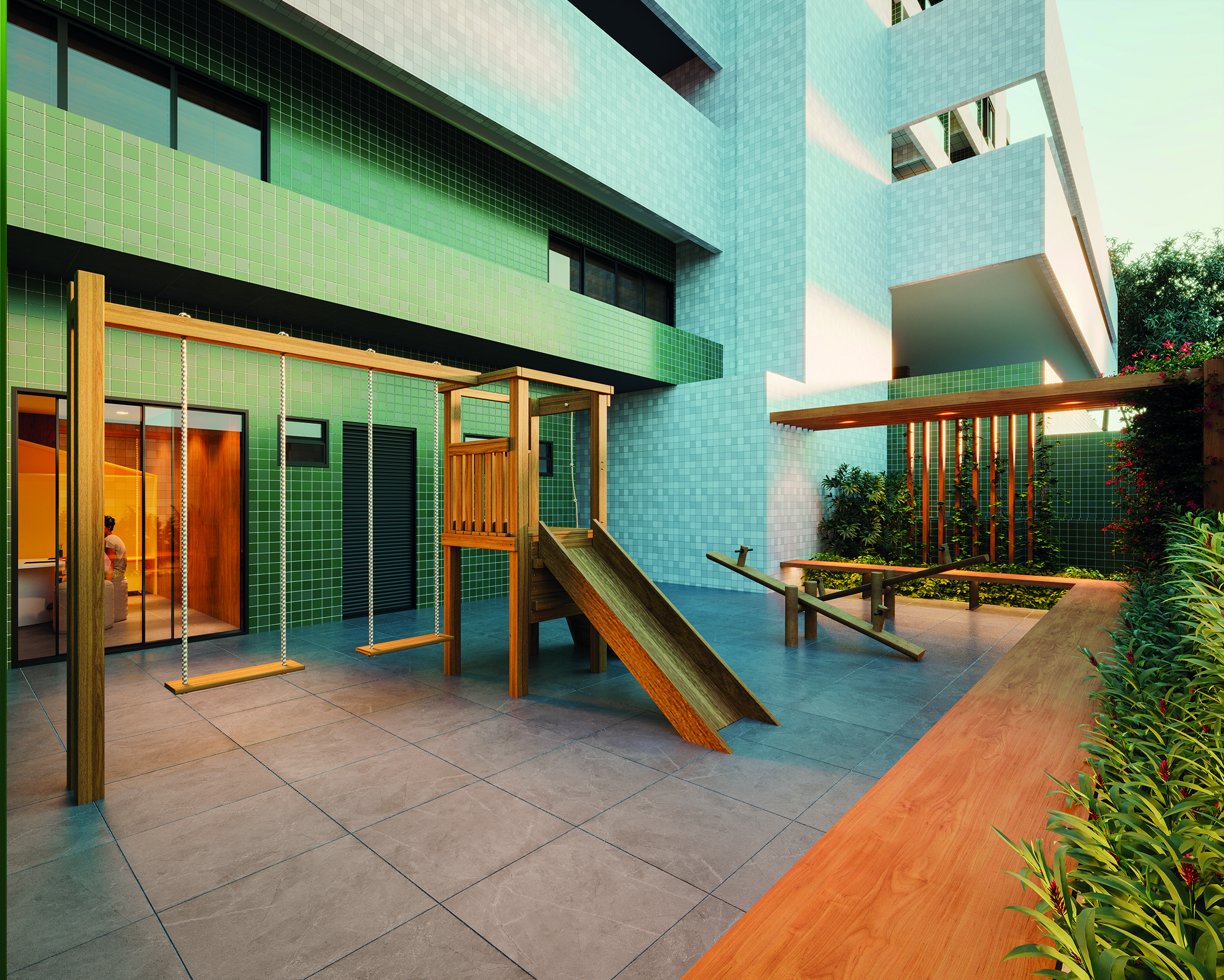 O projeto conta com espaços que incentivam o uso coletivo, sem abrir mão da privacidade, são eles; o espaço fitness, a brinquedoteca e o playground, os terraços, piscinas entre outros. Dessa forma, o cotidiano ganha mais significado nos encontros espontâneos, nas conversas ao fim do dia e nos momentos simples que fortalecem a vida em comunidade.